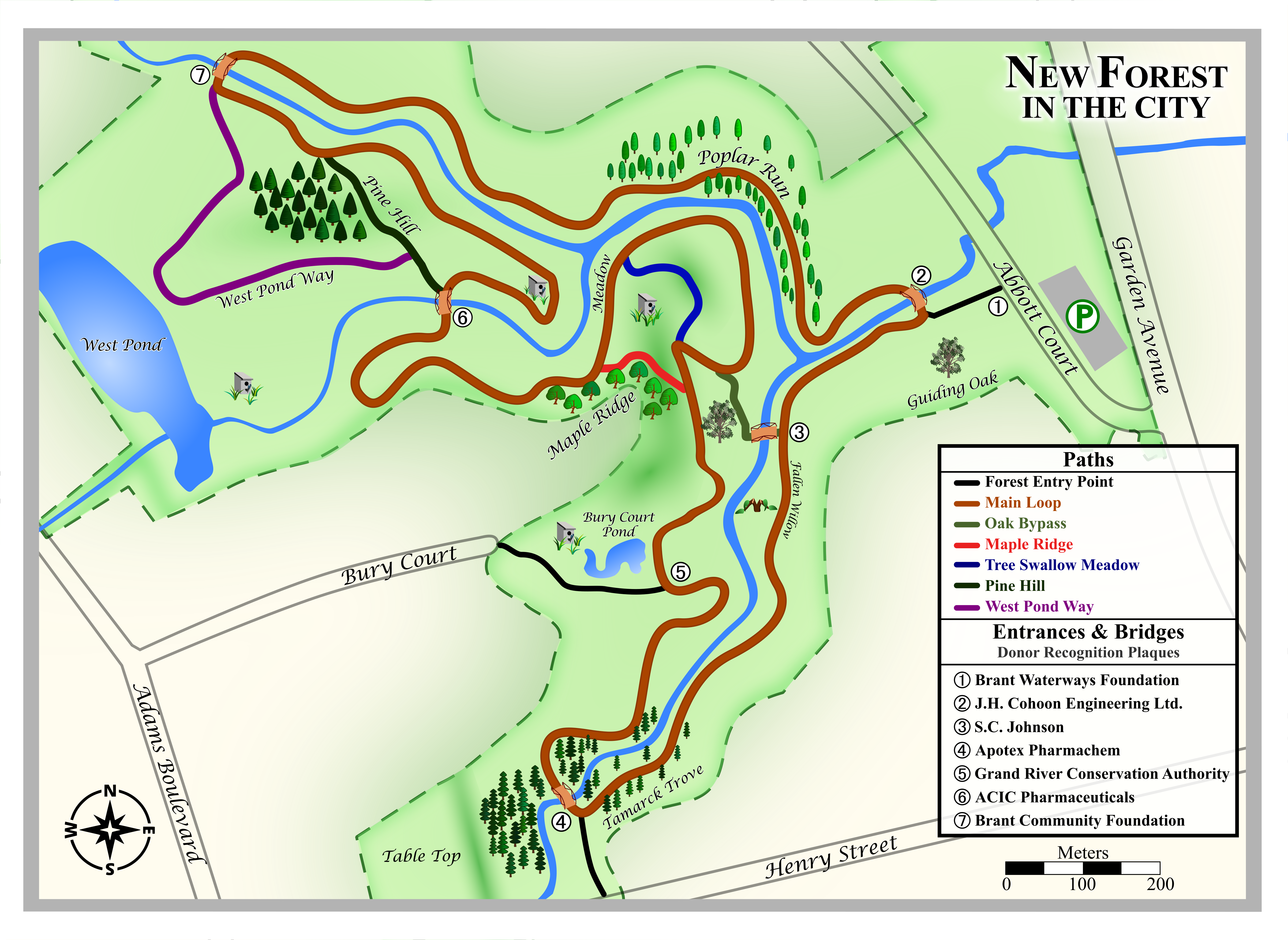 This map shows the trail system and features of Brantford’s New Forest in the City, a community-driven project that transformed undevelopable land into a growing urban forest. With more than 74,000 trees planted by volunteers, businesses, schools, and local organizations, the site now provides over 5 km of walking trails, habitat for wildlife, and much-needed green space within the city.